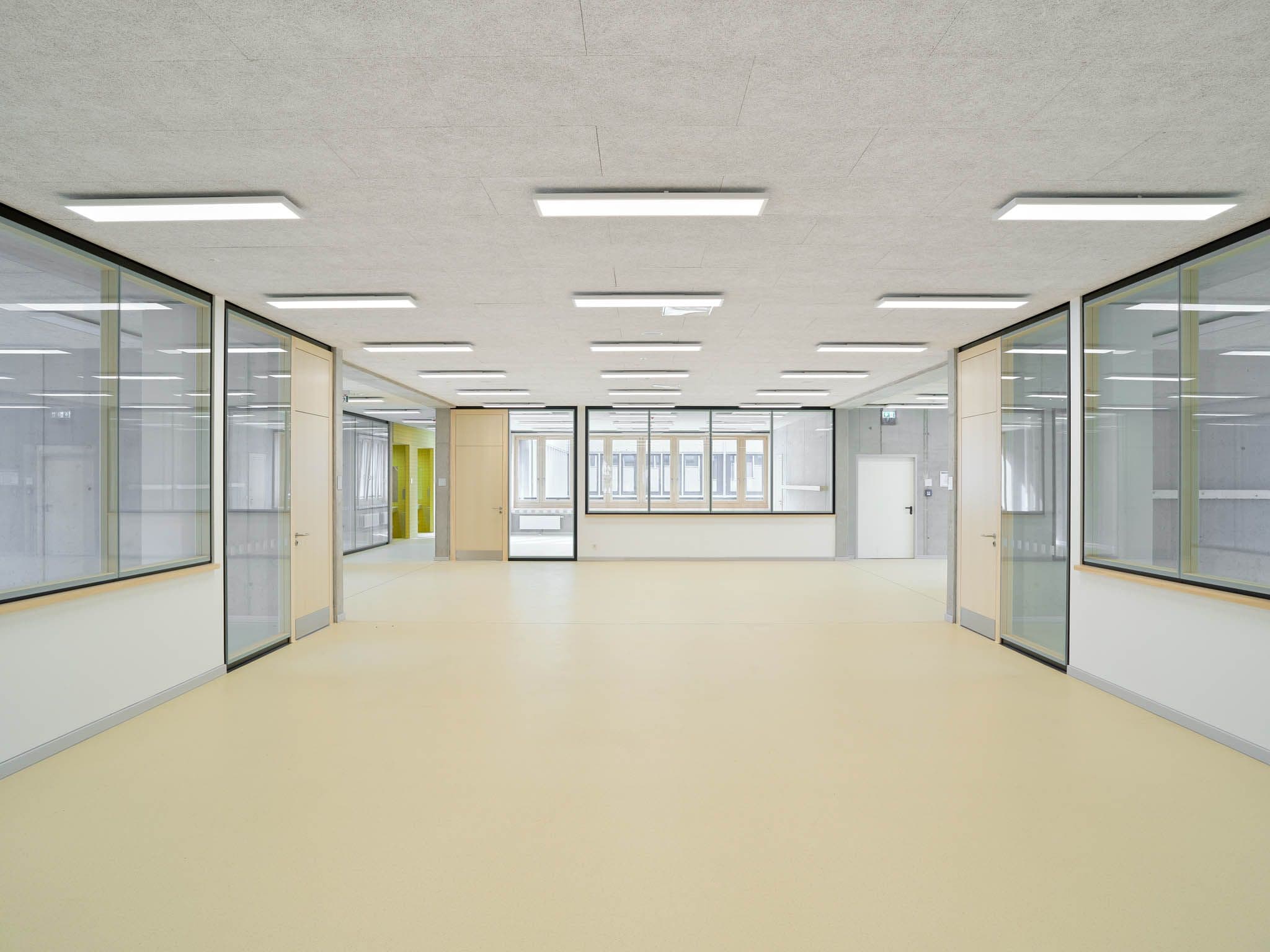 Each cluster consists of five classrooms with differentiation facilities and a multifunctional centre, which can be used as a group and individual work area, as a space for movement and retreat, as a communication and quiet zone. This division enables a flexible response to changing pedagogical concepts. The glass walls in the learning cluster offer a high quality due to their transparency and create a clearly arranged learning unit. The teachers' team room in the cluster replaces the traditional staff room.