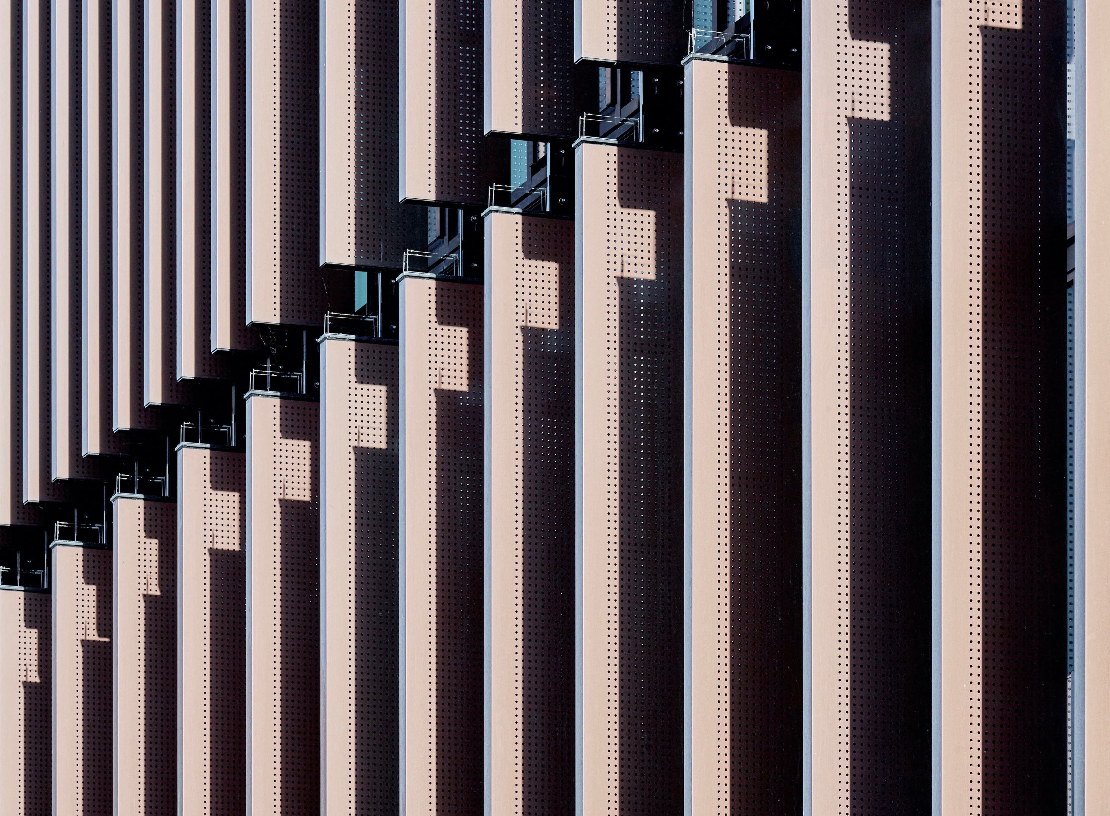 Als übergreifendes architektonisches Thema verbinden sichdie vertikalen Strukturen der Fassade mit den vertikalen Stahlgeländern und Wandgestaltungen im Atrium und Freiraum. Die Pfosten-Riegelfassade aus Lärchenholz ergänzt sich harmonisch mit den Parkettfußböden der Veranstaltungs- und Büroflächen. Außen gliedern sich die Fassaden in drei horizontal geschichtete Geschossbänder, die mit offenen und geschlossenen Bereichen auf die dahinter liegenden Nutzungen reagieren. Durch die Lochung der vertikalen vorgehängten Lamellen wird die Transparenz und Feinheit der Fassade betont. Variierende Abstände der feststehenden Kupferlamellen beleben das Fassadenbild, wobei die Verdichtung an den Gebäudeecken im Sommer die Aufheizung der Eckräume begrenzt.
